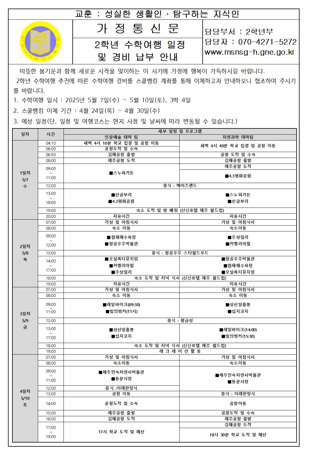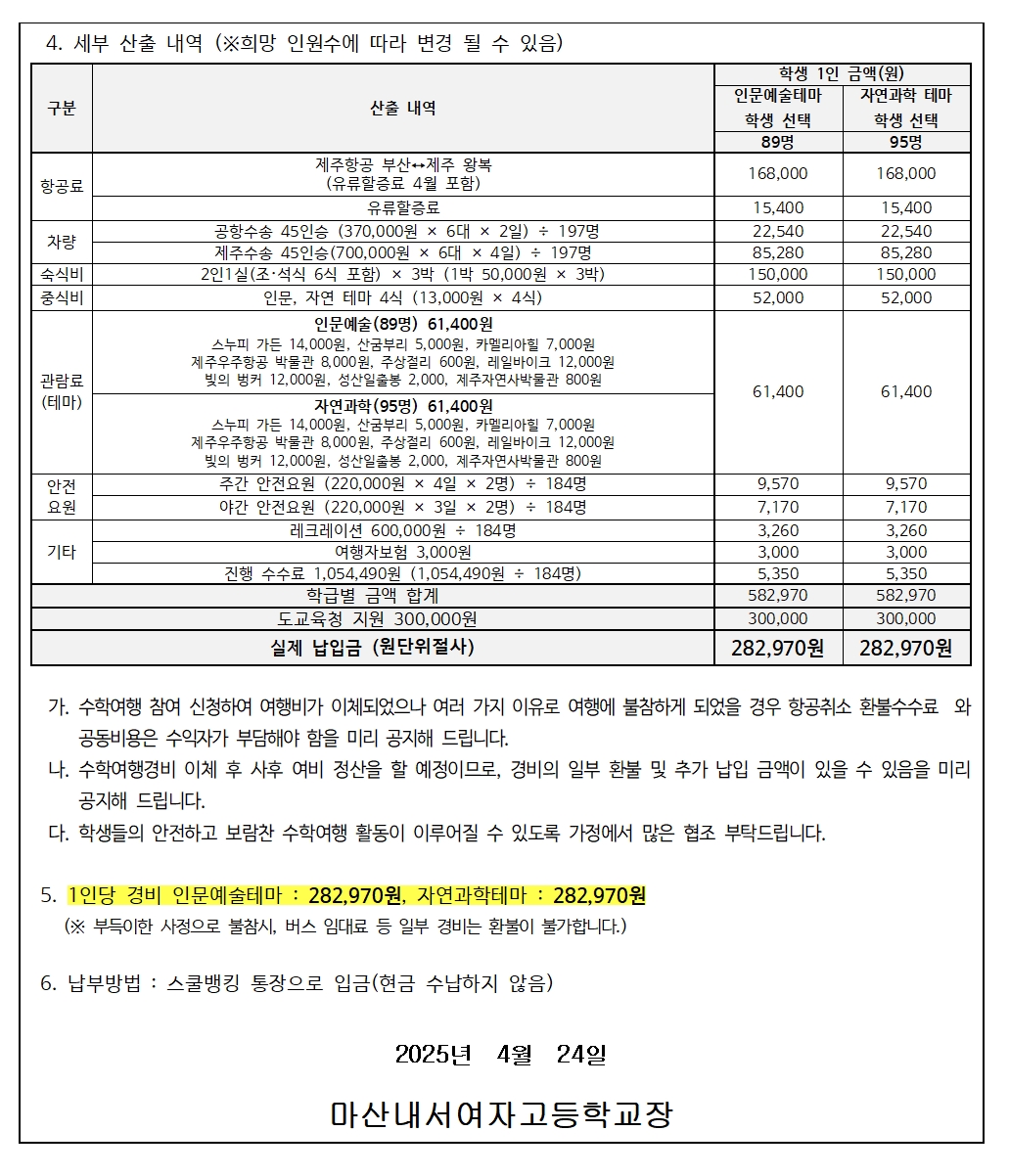 2025. 2학년 수학여행 일정 및 경비 납부 안내